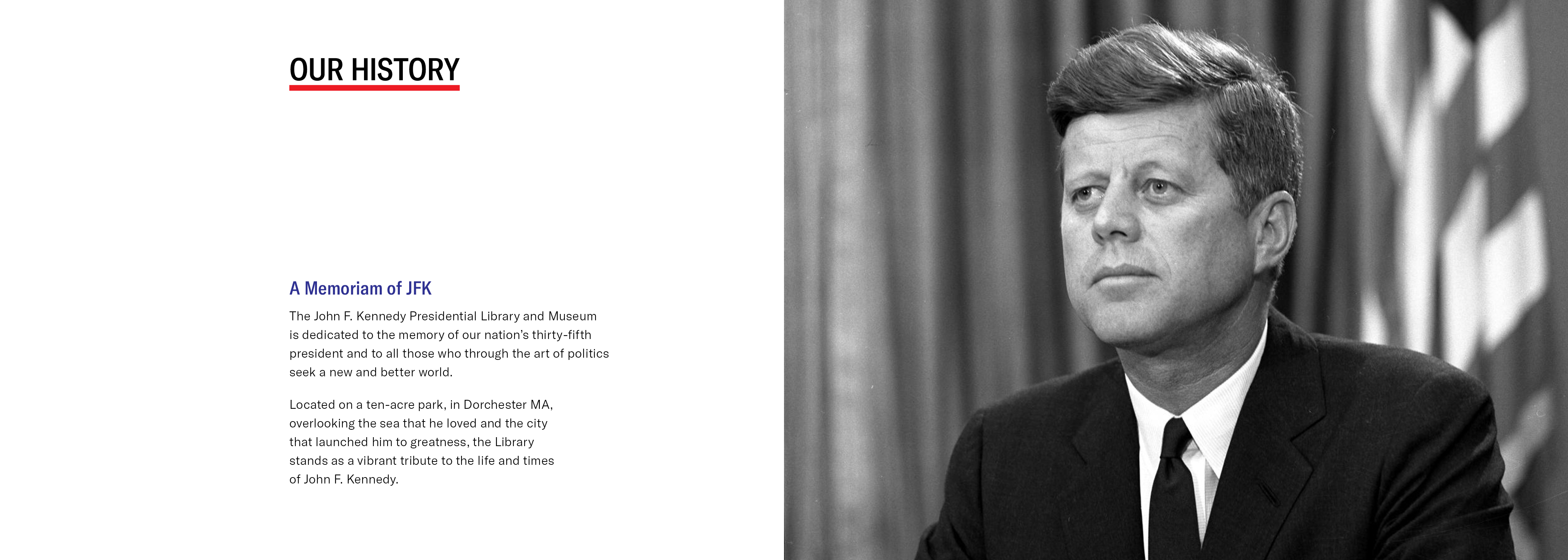 In creating a new brand identity for the JFK Library a new logo mark, typeface, and stationery set were created. After a site visit was conducted it was decided that other than the content of the museum the most recognizable aspects were the architecture and large American flag hanging vertically in the pavilion. The new logo mark combines the symbol of the American flag and the unique architecture of the building. This reflects the patriotism of the library and pays homage to the architecture of I.M. Pei.